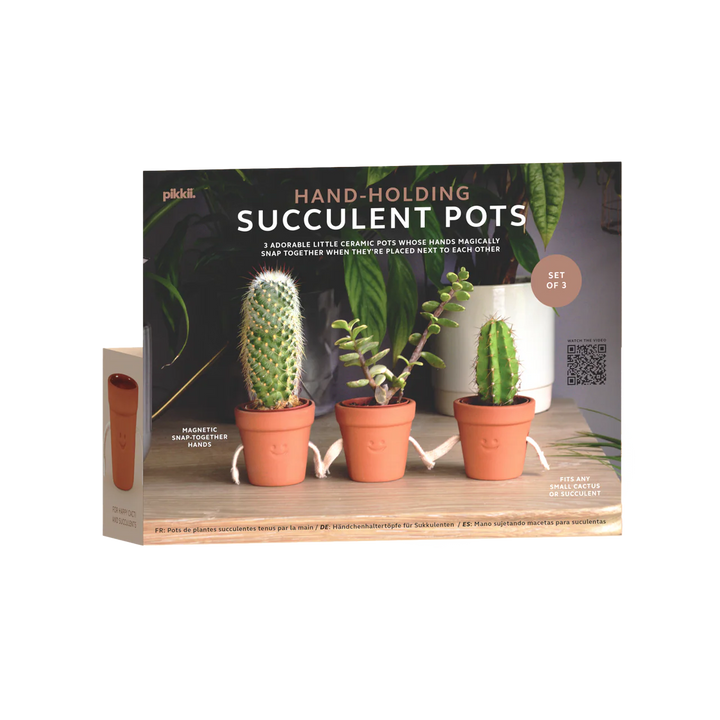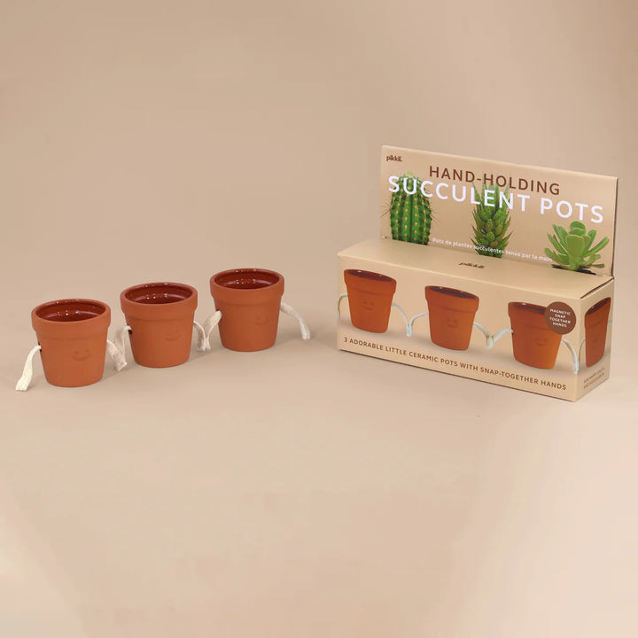שלושה עציצים קטנים וחמודים מקרמיקה — שידיהם “נתפסות” זו בזו באופן קסום כשהם קרובים זה לזה.