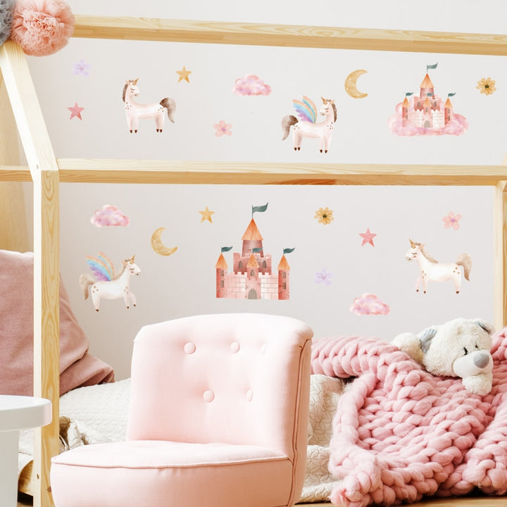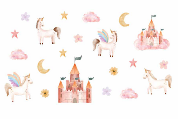 חבילת מדבקות לקיר בצבעי מים בנושא חד קרן וטירות.